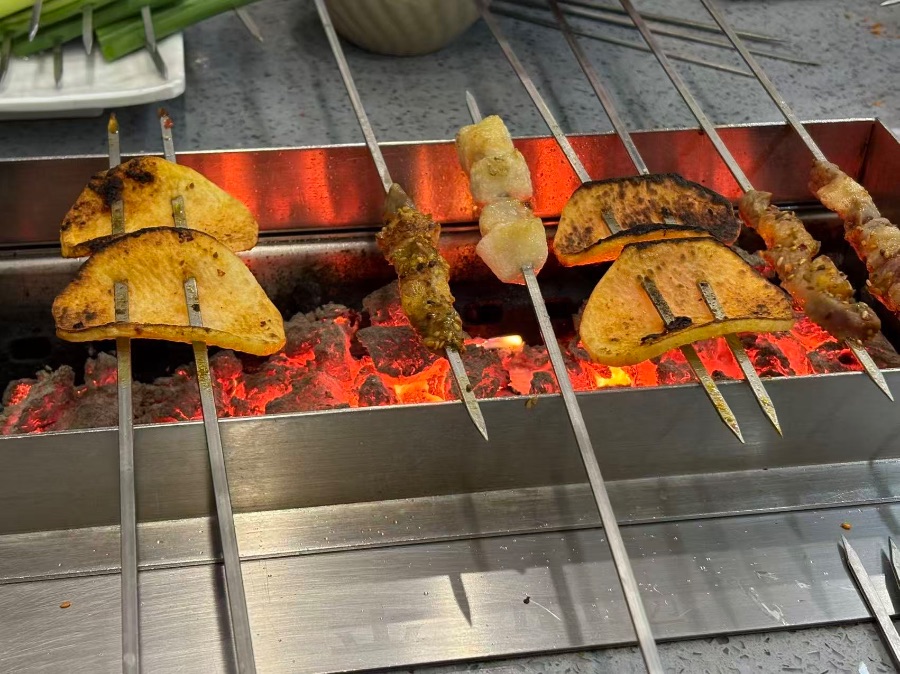 自己烤,是延吉烧烤的灵魂。把串在烤架上铺开,油脂滴在炭上滋滋作响,火苗蹿起又落下。翻动间,肉香混着炭火气钻进鼻子。烤到两面焦黄、边缘微卷,滋滋往外冒油时,火候正好。