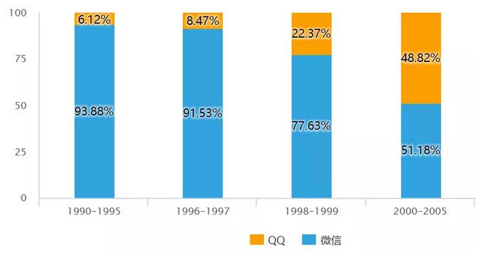 在这个问题的回答上,可以说QQ全军覆没,1990-1995年的同学放弃QQ的比例高达91.84%,即使是依然喜爱他的00后选择放弃QQ的也超过半数。