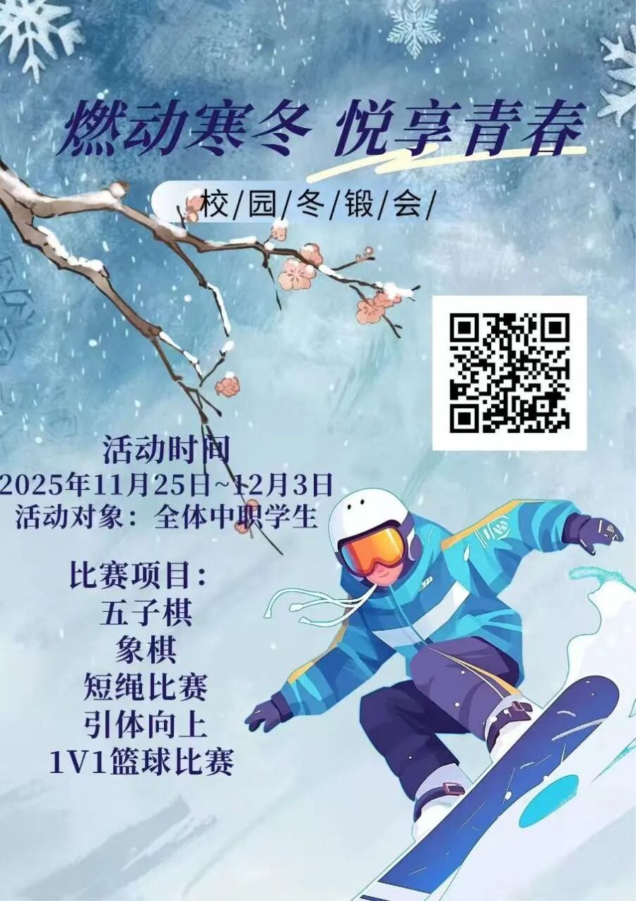 让青春活力,在寒冬尽情释放!冬季运动会的舞台已搭好,无论是五子棋、象棋的智力交锋,还是短绳、引体向上、1V1篮球的体能比拼,总有一个项目等你来挑战!欢迎同学们根据兴趣和特长报名参与,具体规则快来看吧!