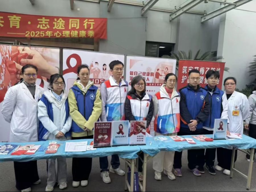 2025年12月1日世界艾滋病日,卫生所以“青春无‘艾’携手同行”为主题,开展系列防艾科普宣传活动。为让防艾知识精准触达每一位同学,青年志愿者们主动牺牲就餐时间,以轮流值守、交替服务的方式坚守岗位,用责任与热忱为校园健康筑起坚实屏障。