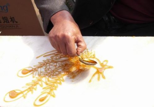 卖糖画的小摊贩,挑着糖担子,内有一炉一锅一石板,一铲一凳一转盘。他们的转盘上画了一圈小动物,转到什么就用糖画一个,所以糖画又叫转糖。师傅将炼制后的红糖置于铜瓢内加热熔化,然后以铜勺为笔,以糖液作墨,在光洁的大理石板上拌提、顿、放、收,时快时慢,时高时低,随着缕缕糖丝飘下,栩栩如生地小动物形象便呈现在眼前。